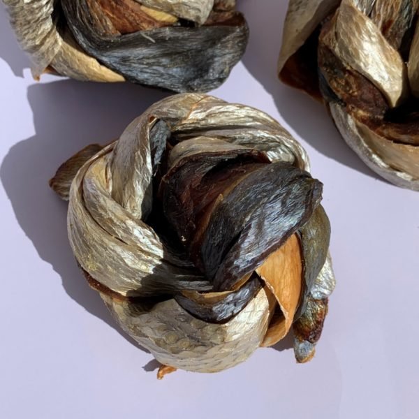 Fish Skin Knots are made from fish skin that has been tied into a knot and then dehydrated. These are a roundish treat and therefore provide your dog with a good chew as they tackle the shape.